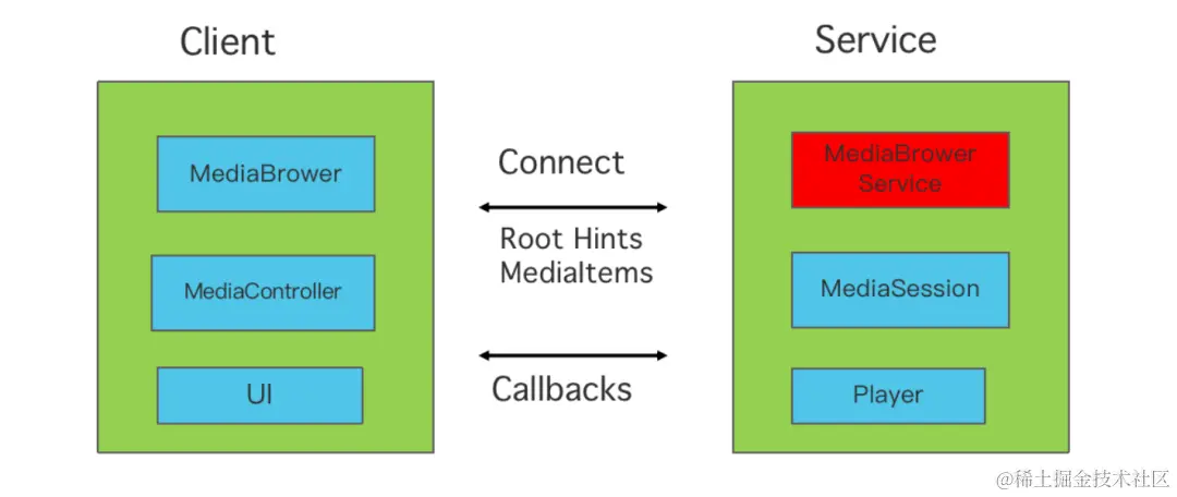 MediaBrowser与MediaBrowserService的实现架构如图所示。MediaBrowser作为客户端,实现了UI、媒体控制和媒体浏览的功能,连接MediaBrowserService,获得媒体内容层次结构的表示,如播放列表、媒体库等等,并获得有关播放状态的回调信息。