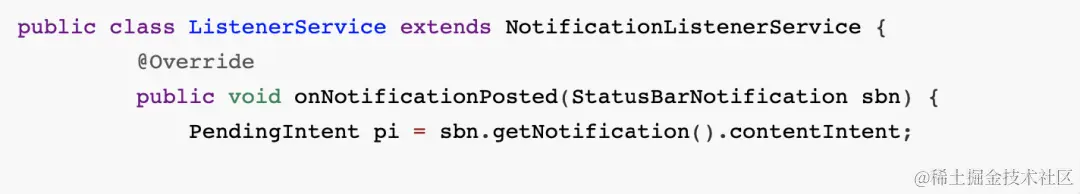 经过用户授权后,通知监听服务就可以获得通知对象,进而获得对象中的PendingIntent。如下,可以在onNotificationPosted回调函数中获取通知及其content Intent PendingIntent。