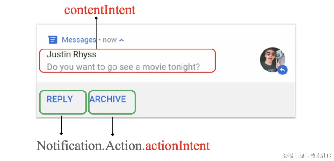 通过 setContentIntent 方法对通知设置了一个contentIntent PendingIntent,使用户在点击通知的正文时,触发PendingIntent,跳转到AlertDetails。除了contentIntent外,通知中还可以设置其他按钮,通过actionIntent进行设置,下面的通知示例表明了通知中的各种PendingIntent。另外,通知还可能包括另外一个deleteIntent PendingIntent,在被用户删除通知时触发。