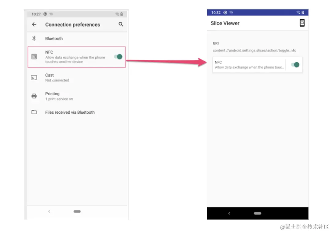 简言之,Slice就是可分享的UI界面,包括图标、文本和动作(SliceAction),Slice通过URI来唯一标识。例如Settings中打开NFC开关的这个界面,就可以通过SettingsSliceProvider中
