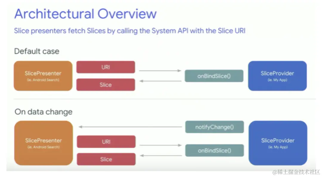 SliceProvider是自Android P开始引入的一种应用程序间共享UI界面的机制,Slice的呈现者(SlicePresenter),可以通过Slice URI和Android系统提供的bindSlice等API来访问另一个App通过SliceProvider分享出来的Slice。