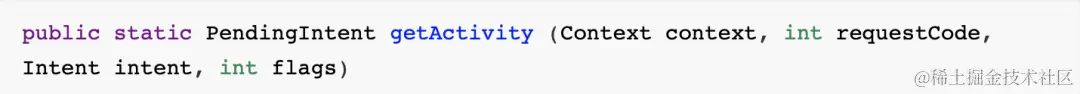 首先,App可以使用getActivity、getBroadcast、getService等API向Android系统申请一个PendingIntent对象,例如在函数getActivity :
