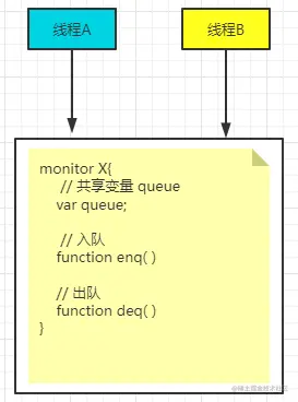 管程解决互斥问题很简单,就将不是线程安全的方法和变量全部封装起来,仅对外提供线程安全的方法,如下图所示,管程X将共享变量队列queue和入队操作enq,出队操作deq都封装起来,只能采用管程提供的入队操作enq,出队操作deq,保证线程安全操作。