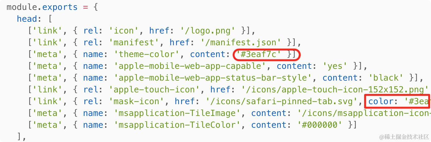 ['meta', { name: 'theme-color', content: '#3eaf7c' }],