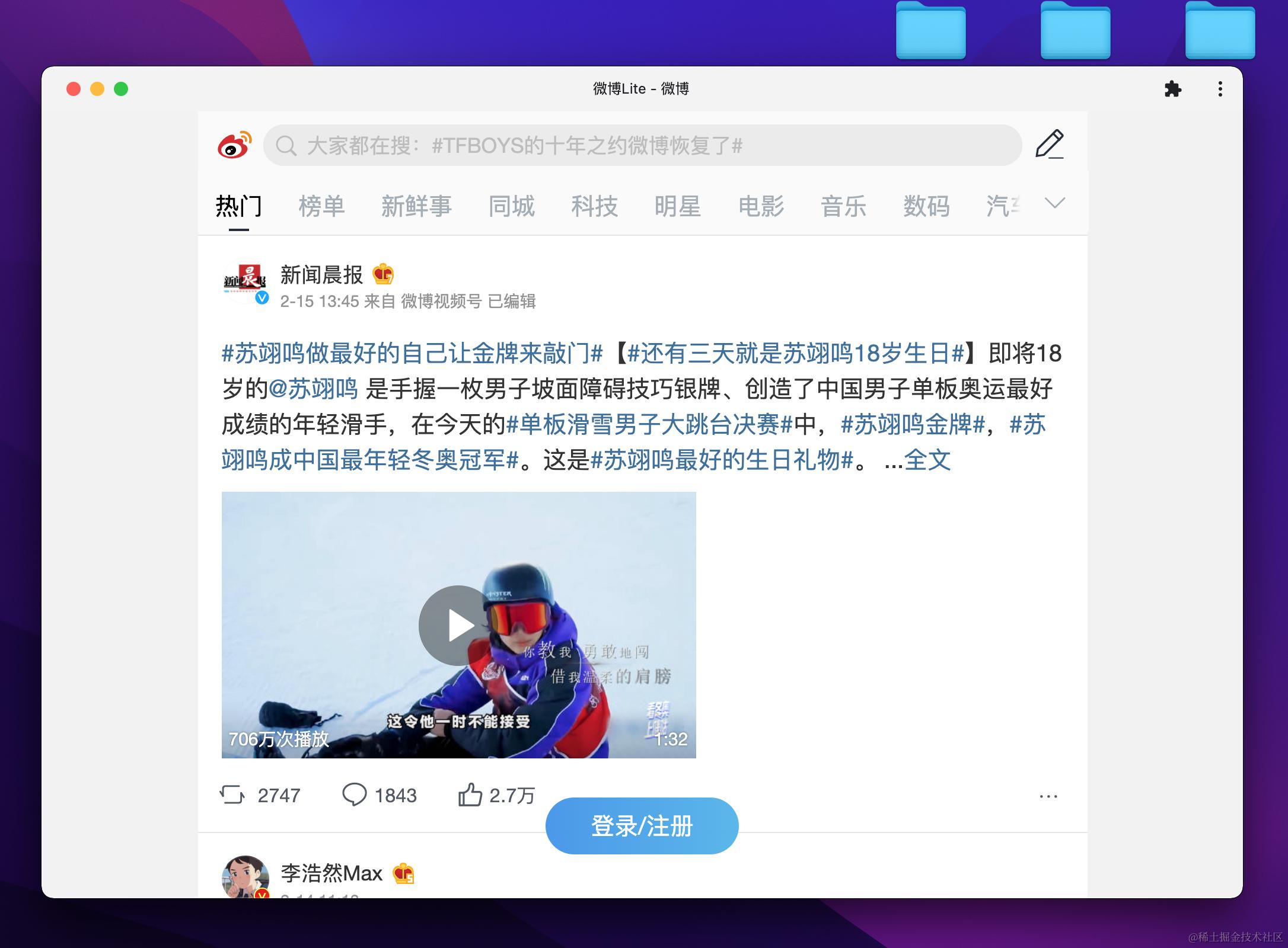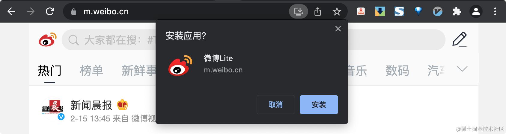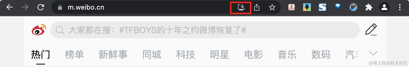 如果你之前没有了解过 PWA,大概率可能也不明白这是个什么效果,没有关系,我们直接看一个 PWA 应用示例,我们打开 m.weibo.cn/,这里是在电脑端打开的: