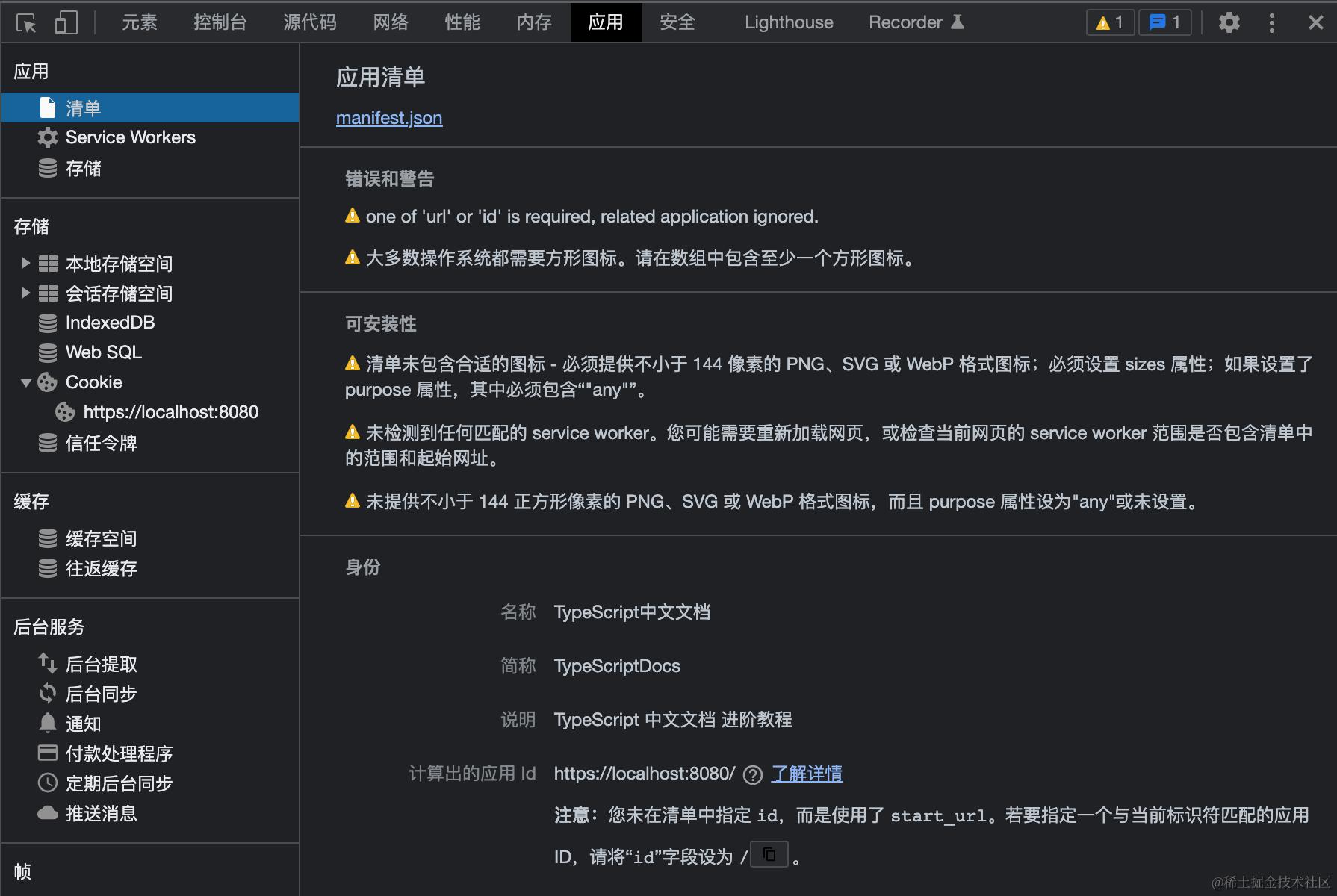 但如果没有显示该图标,我们可以查看开发者工具里的「应用」 -「清单」,其中会显示出现的错误: