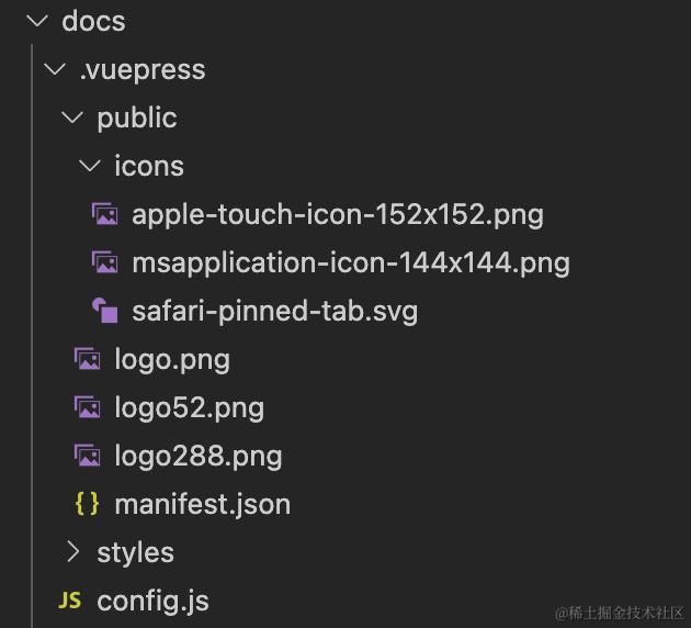 接下来我们添加所需要的资源,在 .vuepress目录下建立 public文件夹,然后添加所需要的文件如 manifest.json文件:
