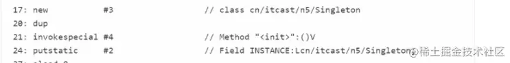 实际上我们只需要关注下面四行字节码,也许jvm会进行优化,进行指令重排,24会在21之前执行,先把引用地址赋值给静态变量,再调用构造方法。