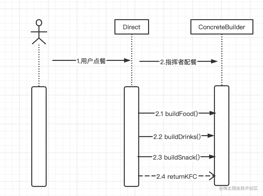 抽象建造者中定义了抽象方法的同时还定义了返回的产品,同时还引入了指挥者,指挥者角色的存在首先将顾客和产品的建造过程进行了隔离,其次负责产品的配置过程,指挥者针对抽象建造者编程,这里客户端是不需要参与的,客户端只需要知道具体建造者类型就够了,客户端可通过具体的建造者建造出具有相同属性不同类型的产品,比如需要套餐A(汉堡,鸡翅,可乐),套餐B(鸡肉卷,鸡腿,果汁)等
