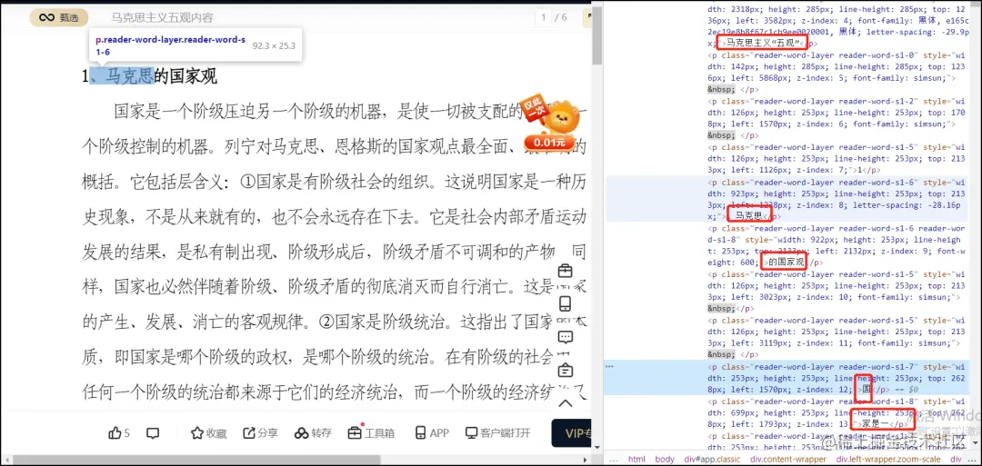文章的文字被切分的很细,很多的p标签(HTML段落标签),存储大量不同的文字,使用xpath匹配目标文字: