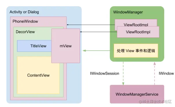 如上图ViewRootImpl是连接view和window的桥梁事务