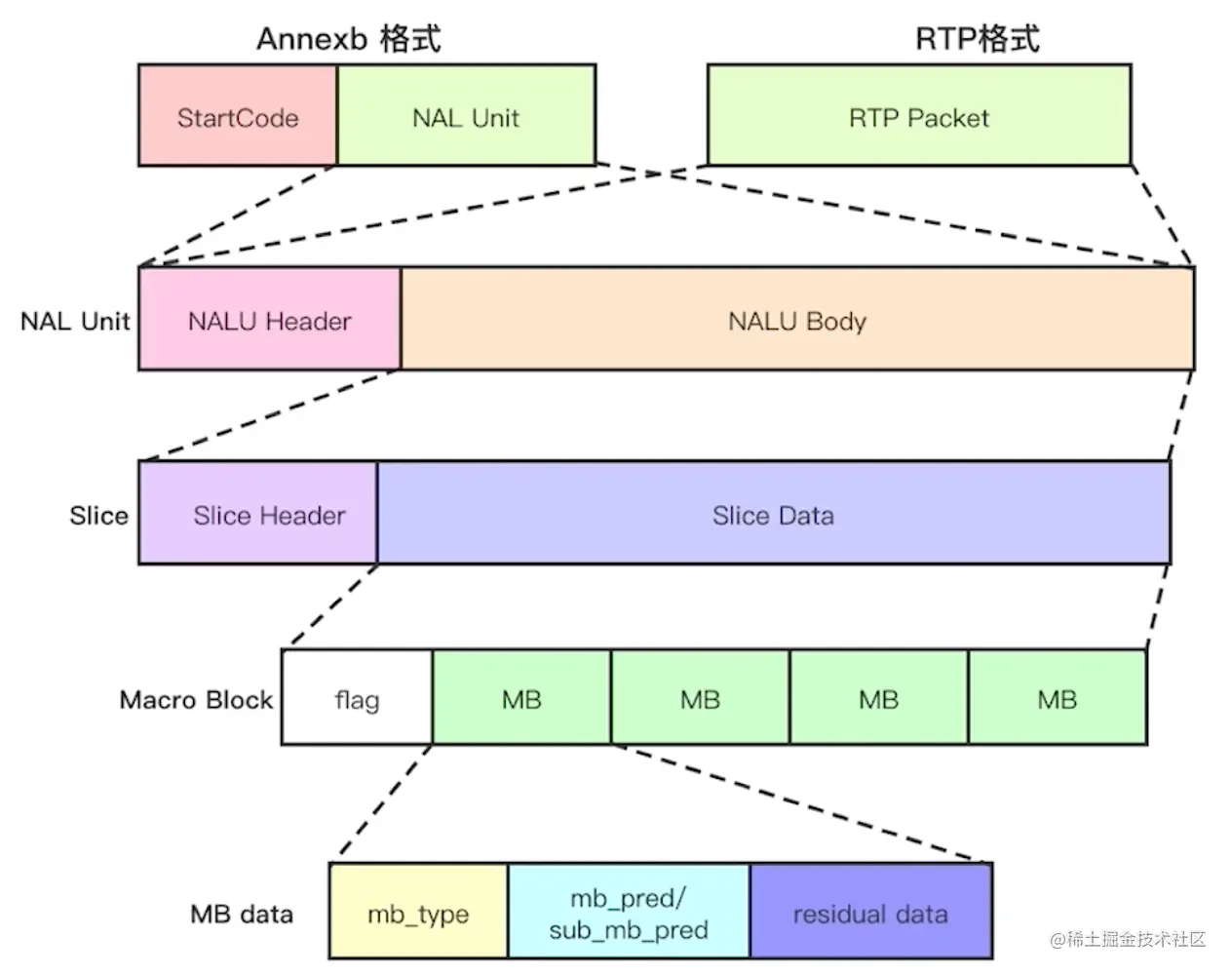 MB data中的 mb_type : 宏块类型, mb_pred/sub_mb_pred : 预测值/子宏块预测值 , residual data : 残差值.