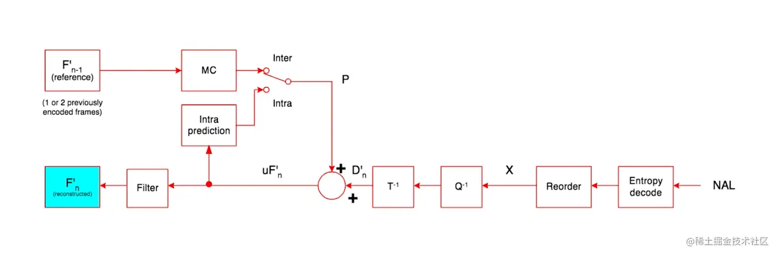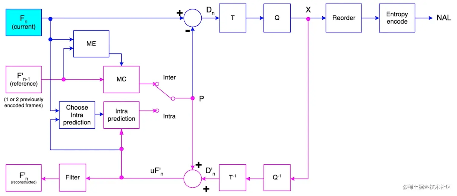 F`n-1(帧间压缩) -> 运动评估(宏块匹配查找) -> 得到运动矢量 -> 推算出运动后帧的值 -> 计算与当前帧的残差值-> (宏块+残差值)转换量化(无损编码) -> 拆包 -> NAL -> 输出.