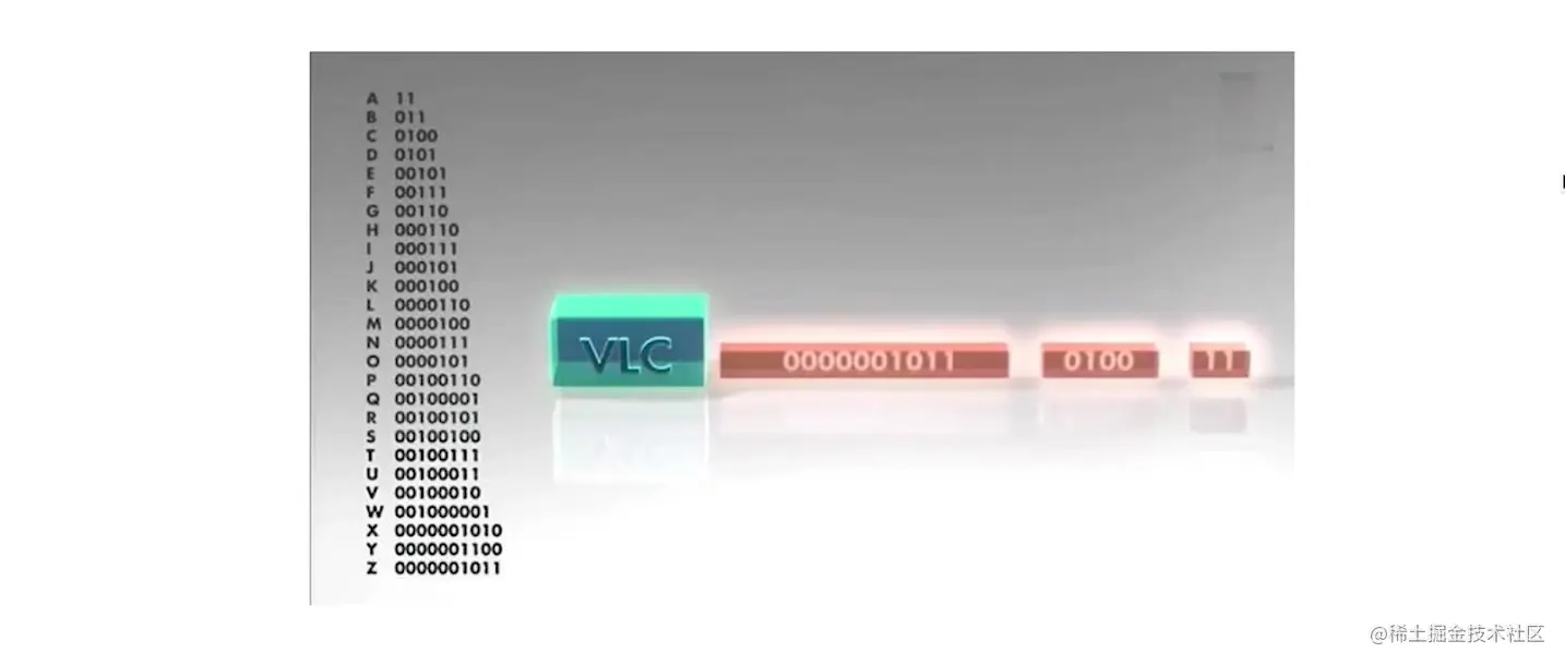 - VLC压缩(MPEG2), 可变长度编码, 如下图A~Z, 假如A的使用频率最高, 则用一个短码将其标识, 反之用长码标识, 高频字符越多压缩率越高, 解压时执行反操作即可无损还原数据.