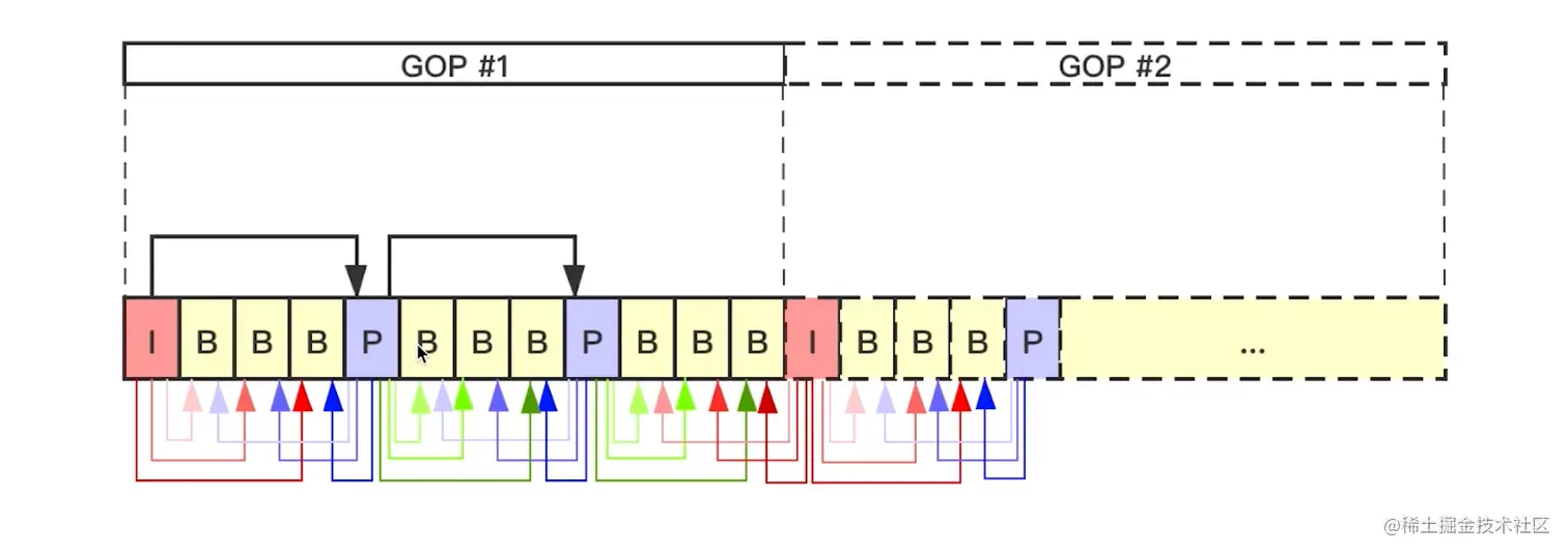 如上图所示 : 第一组 I B B B P 帧, 解码顺序为 I P B B B, I帧作为关键帧 不参考其他帧, 其次参考I帧解码P帧, 再次参考I帧和P帧依次解码每一个B帧, B帧并不参考其他的B帧; 第二组 B B B P 帧, 首先参考前面一组的P帧(此时前面的P帧已解码完成 是一个完成的图像)解码当前的P帧, 再参考前后两个P帧解码中间的B帧.
