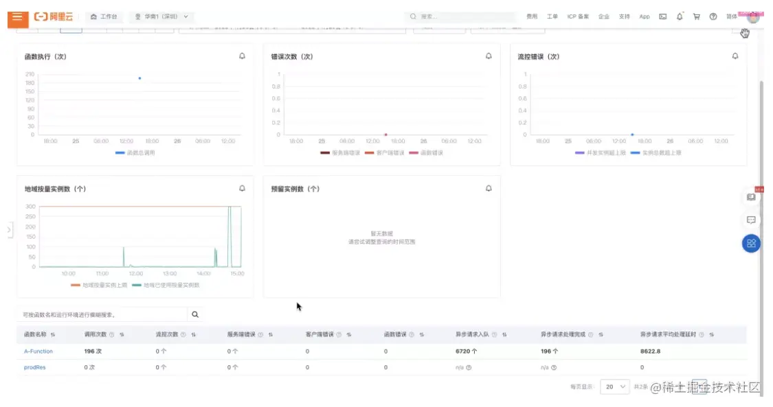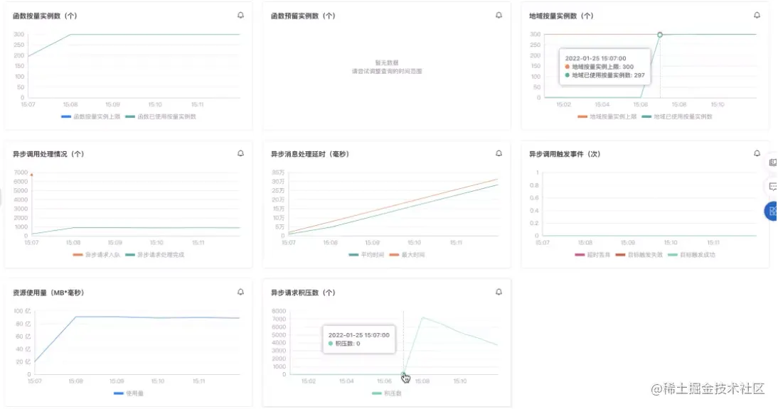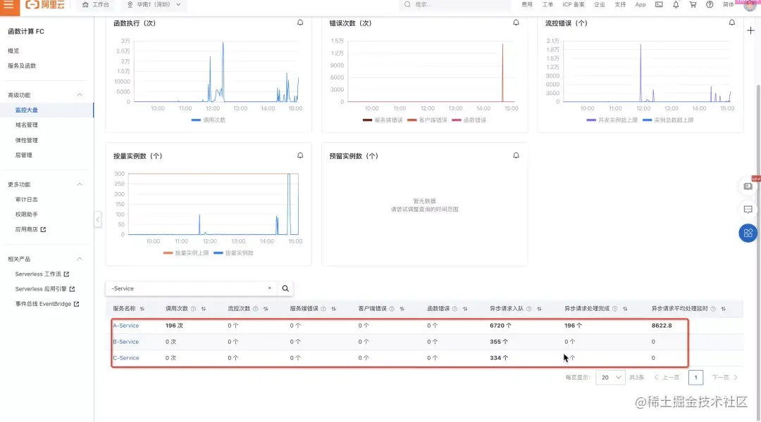 “异步请求入队”、“异步请求处理完成” 以及 “平均处理延时” 这三个指标被放置在监控大盘的概览图表中,旨在帮助用户快速定位到出现积压的函数,解决积压定位难的问题。