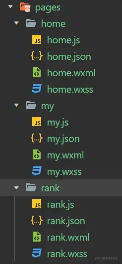 1.1、在pages文件夹中,分别创建三个文件夹home、rank、my,分别对应三个页面题库首页、排行榜页、我的页;
