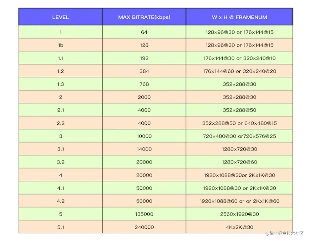 不同的level对应不同的最高分辨率、最高码率、最高帧率