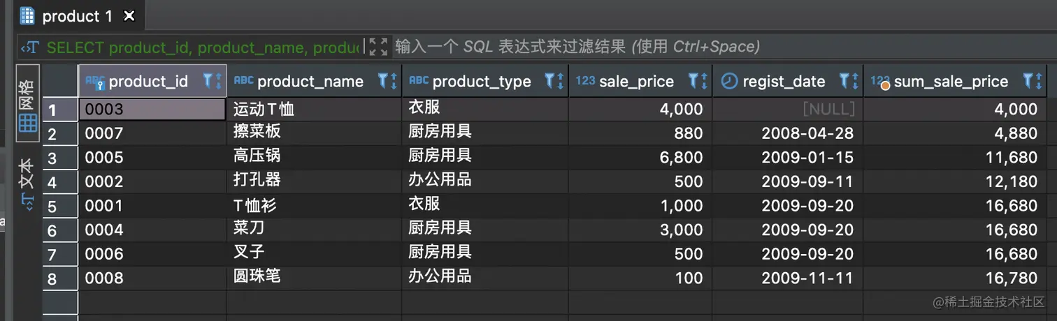 继续使用product表,计算出按照登记日期(regist_date)升序进行排列的各日期的销售单价(sale_price)的总额。排序是需要将登记日期为NULL 的“运动 T 恤”记录排在第 1 位(也就是将其看作比其他日期都早)。
