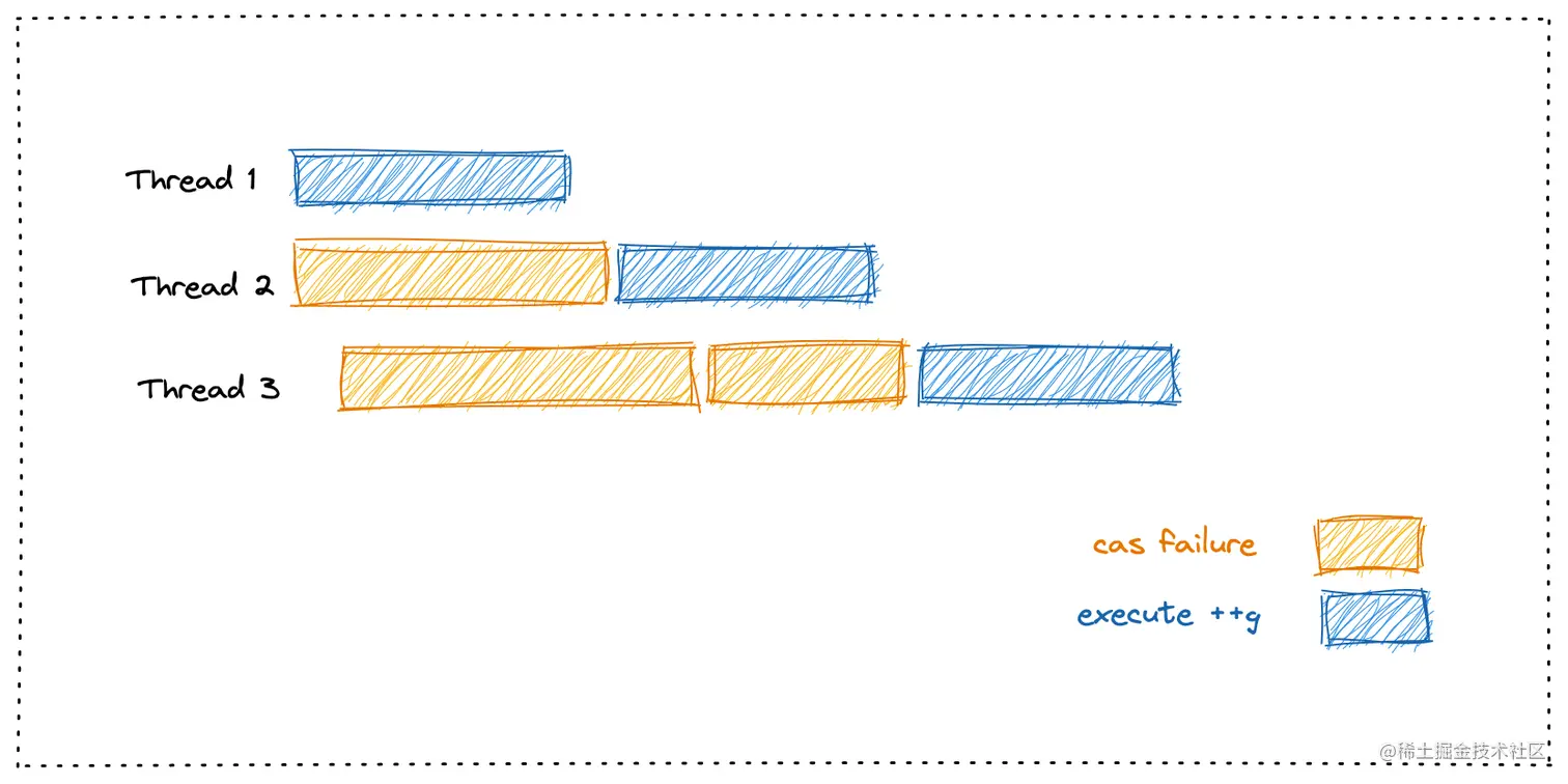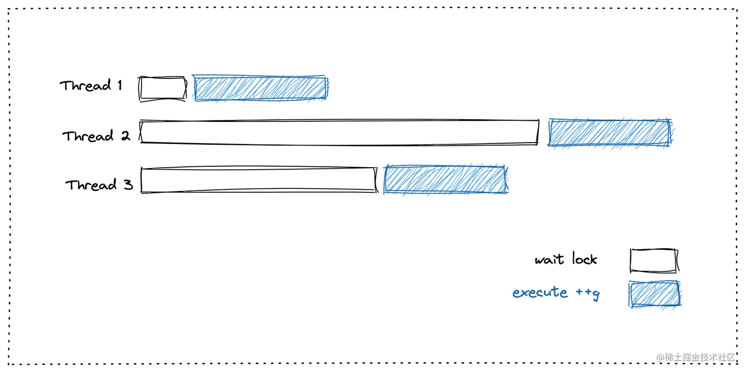 针对上文中提到的「线程并发」场景,容易想到的一种方式是给 ++g 操作加锁,这样就可以保证++g 相关的指令最多只有一个线程在执行。其他的线程要么已经执行完毕,要么在等待获取锁。