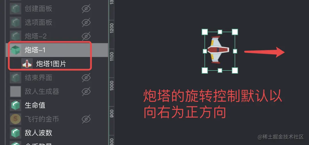 上方讲过,“炮塔”的属性中有一个“是否旋转”的属性,勾选后,炮塔会根据敌人当前的位置自动调整自己的朝向。但是这里有一个需要注意的地方,就是炮塔的旋转默认是以向右为正方向的,如图中的炮筒是向右的,这样在旋转时才能保证炮筒一直朝向敌人。默认的炮塔图片炮筒是向上的,所以,这里我增加了一个容器,将“炮塔”行为添加到容器上,然后调整容器中的“炮塔1图片”朝向右。
