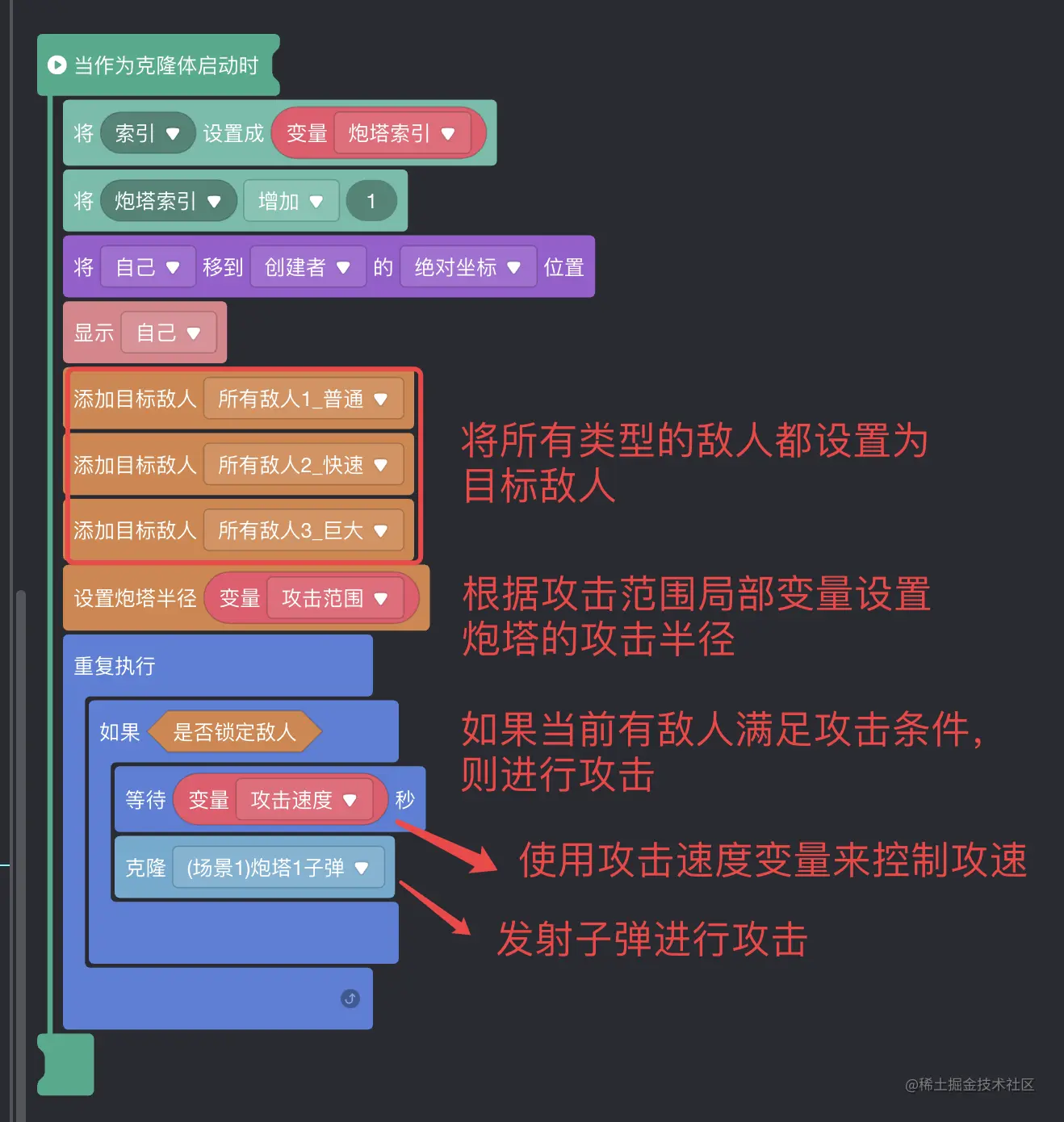 重点关注标注的积木块,首先,我们设置了目标敌人,然后设置攻击范围。最后利用一个循环来处理炮塔发射子弹,这里我们用到了“是否锁定敌人”这个积木块,即只有当前有敌人可被攻击时,炮塔才会发射子弹。