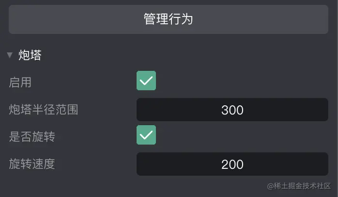 开启行为后,可在属性区下方会看到与“炮塔”有关的几个属性,