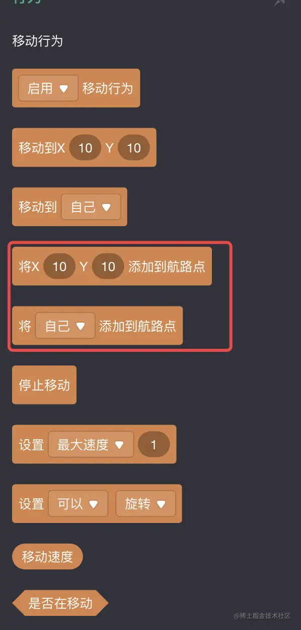 与“移动行为”有关的积木块儿共有 10 个,这里我们只关注与“航路点”有关的两块积木,一个是设置指定的位置,一个是将指定的精灵添加到路径点(其实添加的是这个精灵的位置)。