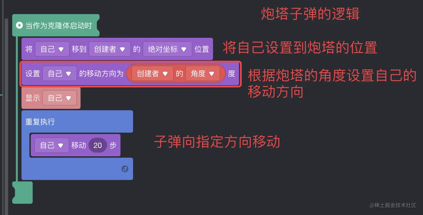 重点是第二个积木块,因为炮塔的朝向是在不停变化的,所以我们使用“创建者的角度”这个积木块获取当前炮塔的朝向角度,然后以此来当作子弹移动方向的角度,这样能够确保子弹是沿着炮筒方向发射的。