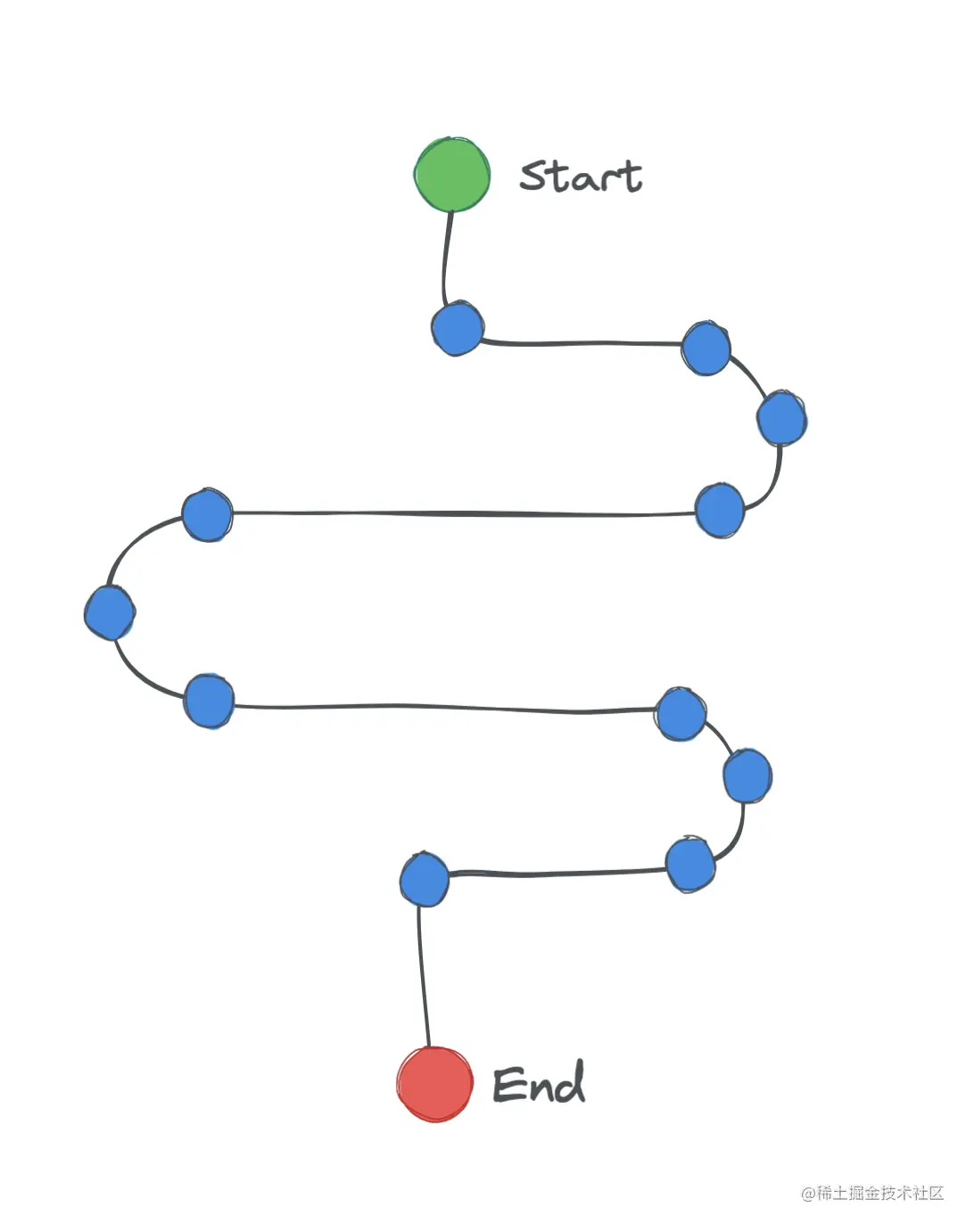 如图,从上方的起始点到最后的结束点, 这之间是一段弯弯曲曲的路线,其实这整段路径可以用中间的这些蓝色的点来表示,敌人只需要从其中的一个点移动到下一个点即可。