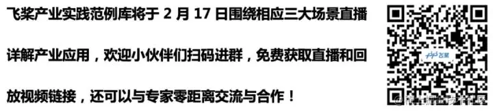 欢迎小伙伴们扫码进群,免费获取直播课和回放视频链接,更有机会获得覆盖智慧城市、工业制造、金融、互联网等行业的飞桨产业实践范例手册! 也欢迎感兴趣的企业和开发者与我们联系,交流技术探讨合作。