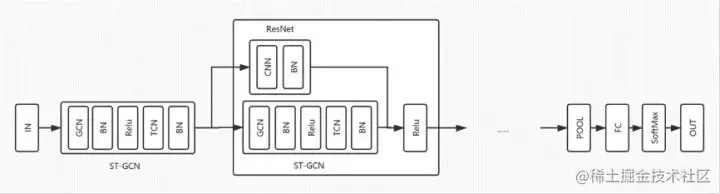 如花样滑冰动作有跳跃、旋转、托举、步伐及转体、燕式步,其中跳跃是最重要的动作要素之一,选手起跳与落冰所用冰刃方式与空中旋转周数分为多种,因此可以产生多种组合,这就增加了分类的难度。为了解决以上问题,技术方案选型的思考是什么呢?本范例通过选择ST-GCN,并在已发布的论文基础上改进了网络结构,为解决基于人体骨架关键点的人类动作识别问题提供了新颖的思路,也取得了较大的性能提升。下图为本项目中构建的ST-GCN网络结构图。