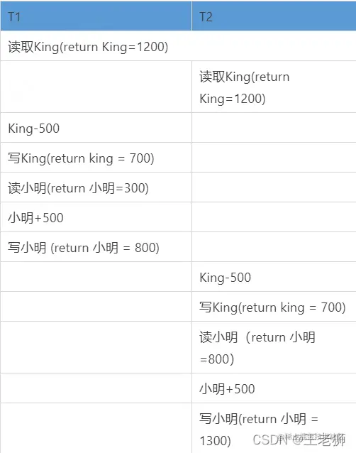 我们将 王老狮向小明同时进行的两次转账操作分别称为 T1 和 T2,在现实世界中 T1 和 T2 是应该没有关系的,可以先执行完 T1,再执行 T2,或者先执行完 T2,再执行 T1,结果都是一样的。但是很不幸,真实的数据库中 T1 和T2 的操作可能交替执行的,执行顺序就有可能是: