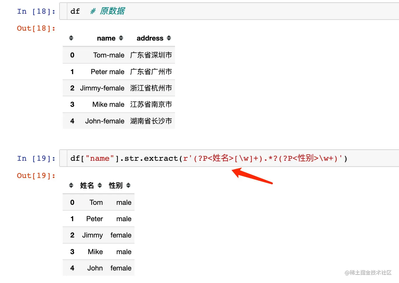 name字段中其实是同时包含了姓名和性别两个信息,address字段中同时包含了省份和城市: