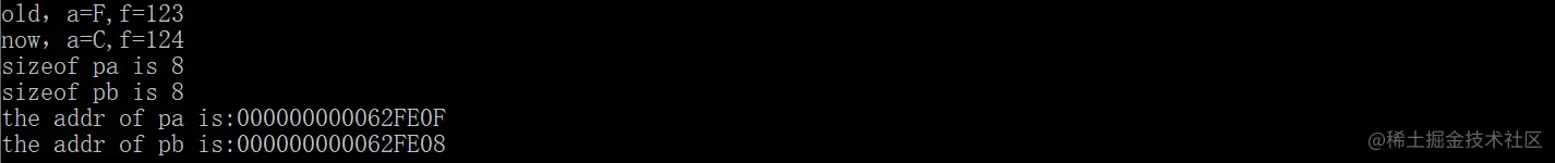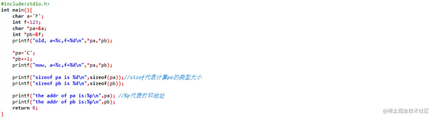 - 如果需要获取某个变量的地址,可以使用取地址运算符(&):char *pa=&a; int *pb=&f;