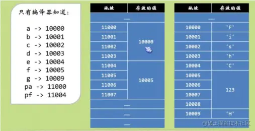 - 内存中对应的地址存放变量的值(以字节为单位分配大小),访问时只有编译器知道变量和值之间的对应关系(通过变量和地址的对应关系确定,且变量始终指向首地址)