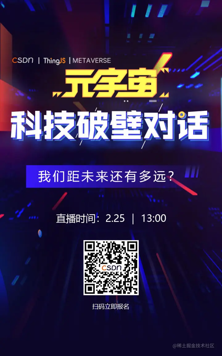 元宇宙|科技破壁对话 我们距未来还有多远? ThingJS_小锘 2022-02-19 532 阅读1分钟 迈入2022年**“元宇宙”**依旧是持续霸榜、话题不断的科技热词。无论是开发者还是企业决策者,或是千千万万的普通用户,对“元宇宙”都存在诸多疑问: 元宇宙是新风口还是伪概念? 目前元宇宙有哪些前沿技术实践? 我们距未来元宇宙世界还有多远? 元宇宙|科技破壁对话,线上直播报名火热进行中!专业大咖将带你开启一场元宇宙技术探索之旅,深度解析技术开发与实践,一起预见未来世界! 赶快扫码报名吧! 如果你对元宇宙领域技术开发感兴趣却不知如何开始, 不如来直播间一起探索答案!