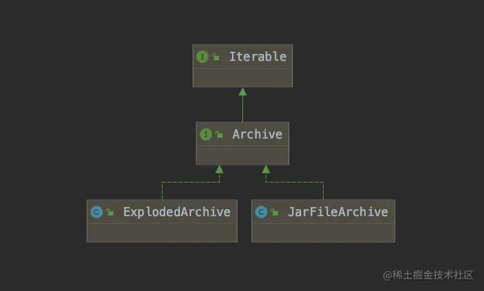 归档文件接口,实现迭代器接口,它有两个子类,一个是JarFileArchive对jar包文件使用,提供了返回这个jar文件对应的url、或者这个jar文件的MANIFEST文件数据信息等操作。是ExplodedArchive是文件目录的使用也有获取这个目录url的方法,以及获取这个目录下的所有Archive文件方法。