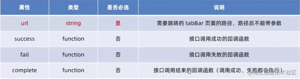 调用 wx.switchTab(Object object)方法,可以跳转到 tabBar 页面。其中 Object 参数对象的属性列表如下:
