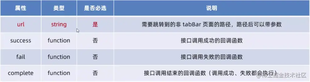 调用 wx.navigateTo(Object object)方法,可以跳转到非 tabBar 的页面。其中 Object 参数对象的属性列表如下: