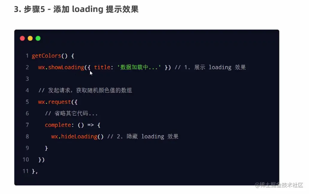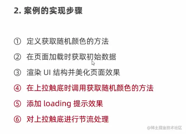 当处理完下拉刷新后,下拉刷新的 loading 效果会一直显示,不会主动消失,所以需要手动隐藏 loading 效果。此时,调用 wx.stopPullDownRefresh() 可以停止当前页面的下拉刷新,示例代码如下: