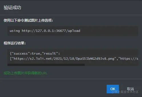 路径选择自己安装PicGo的路径!点击验证图片上传选项,成功的话会有相应提示,如下图: