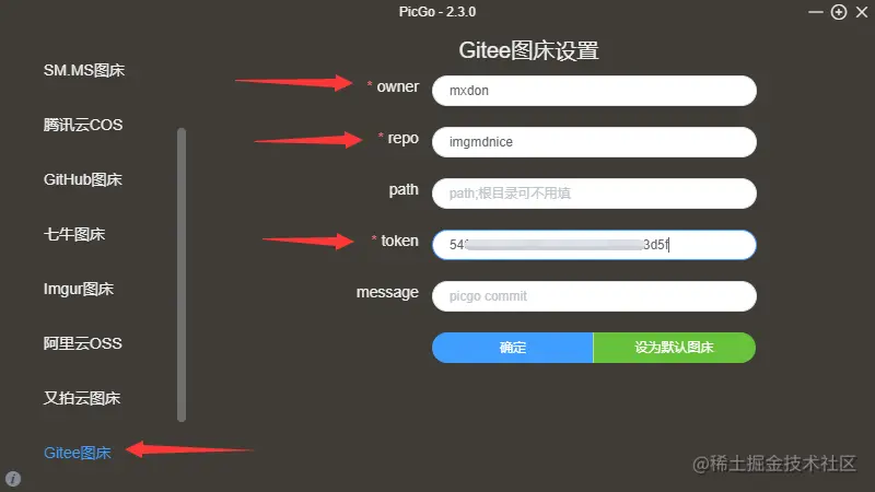 如图三个必填项:gitee用户名、仓库名、token