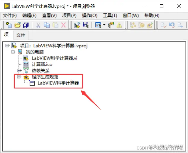 2、程序VI文件必须要在项目中,如果只是单一的VI文件无法进行生成操作,需要用户新建项目,导入VI文件,如下图所示: