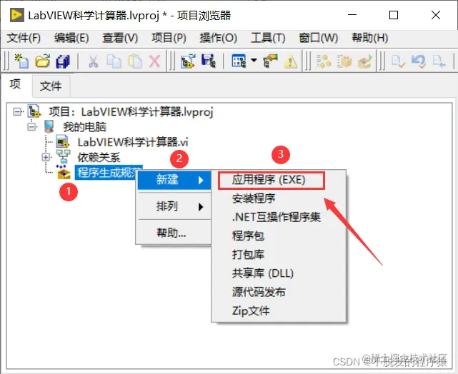 第1步:打开工程项目,选中“程序生成规范”,点击右键,选择“新建”,新建“应用程序EXE”,如下图所示: