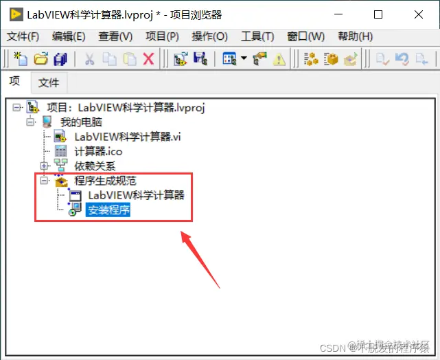 第1步:在工程项目,选中“程序生成规范”,点击右键,选择“新建”,新建“安装程序”,如下图所示: