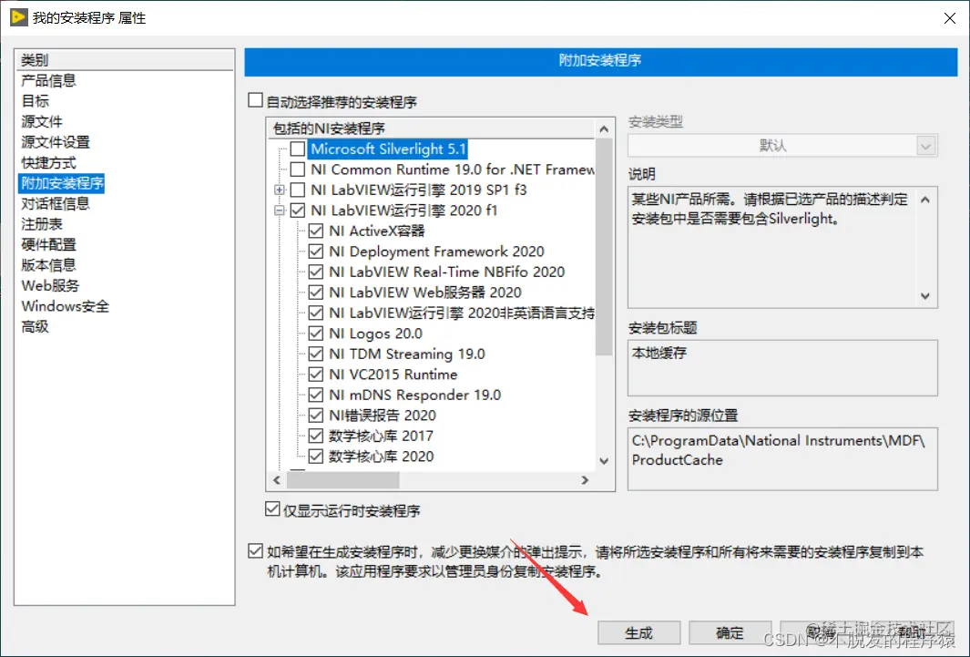 第5步:选择“附加安装程序”,勾选相应的LabVIEW运行引擎和必要的驱动程序以及工具包等,之后这些驱动以及工具包会一起包含在生成的installer中。LabVIEW在这里会自动勾选一些必要的NI安装程序,但是有可能并没有包含所有需要安装的程序,此时程序中使用到了哪些驱动以及工具包,在这里配置的时候就需要勾选哪些工具包。如下图所示: