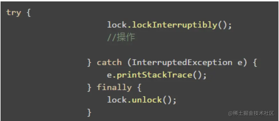 synchronized与Lock在默认情况下是不会响应中断(interrupt)操作,会继续执行完。lockInterruptibly()提供了可中断锁来解决此问题。(场景2的另一种改进,没有超时,只能等待中断或执行完毕)