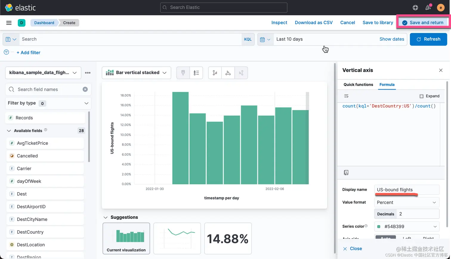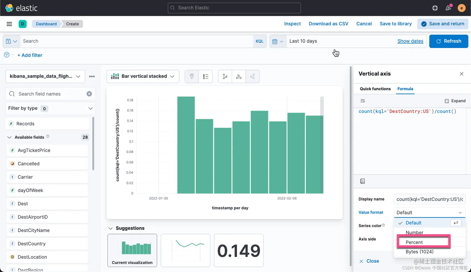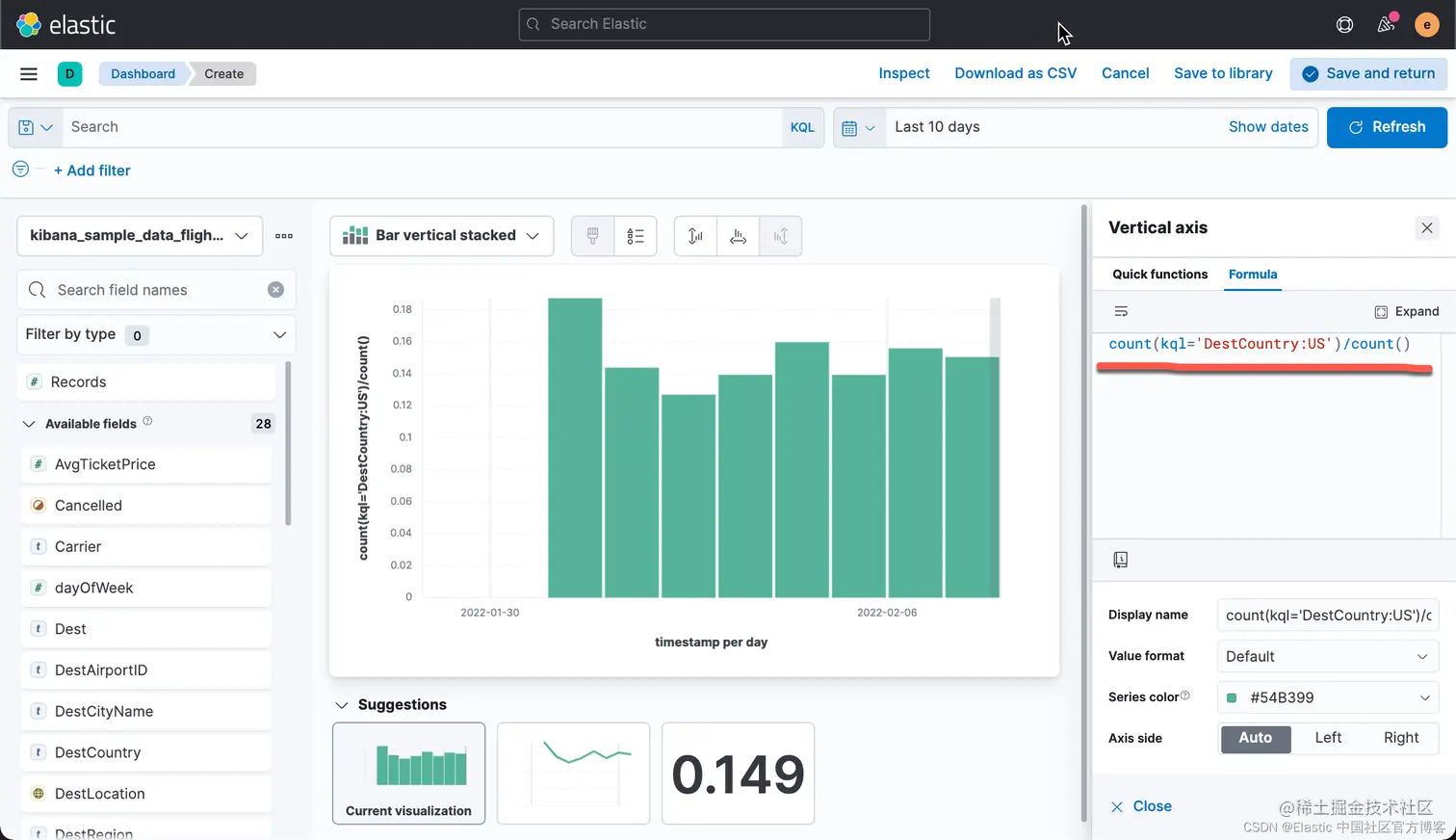 那么返回的数值就是 DestCountry 是 US 的所有文档。如果我们想要计算 DestCountry:US 文档数占总数的比例,那么我们可以使用如下的公式:
