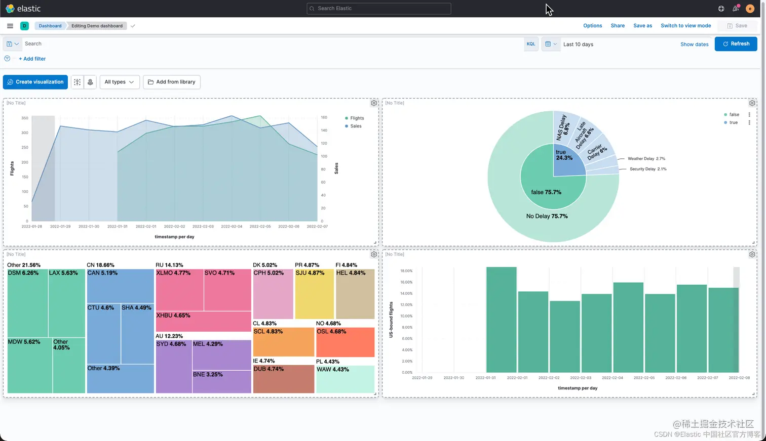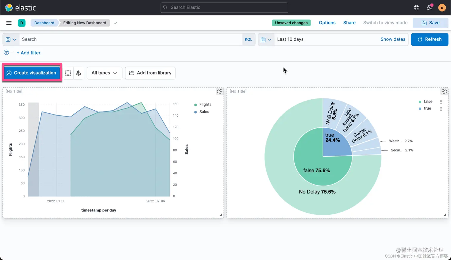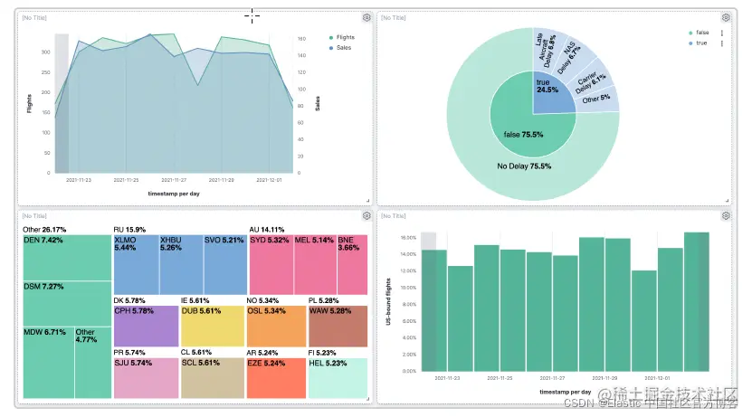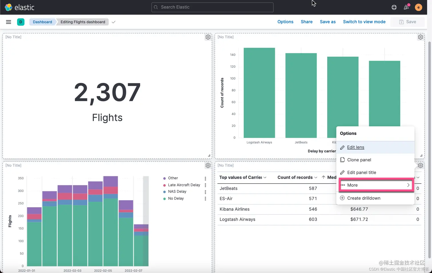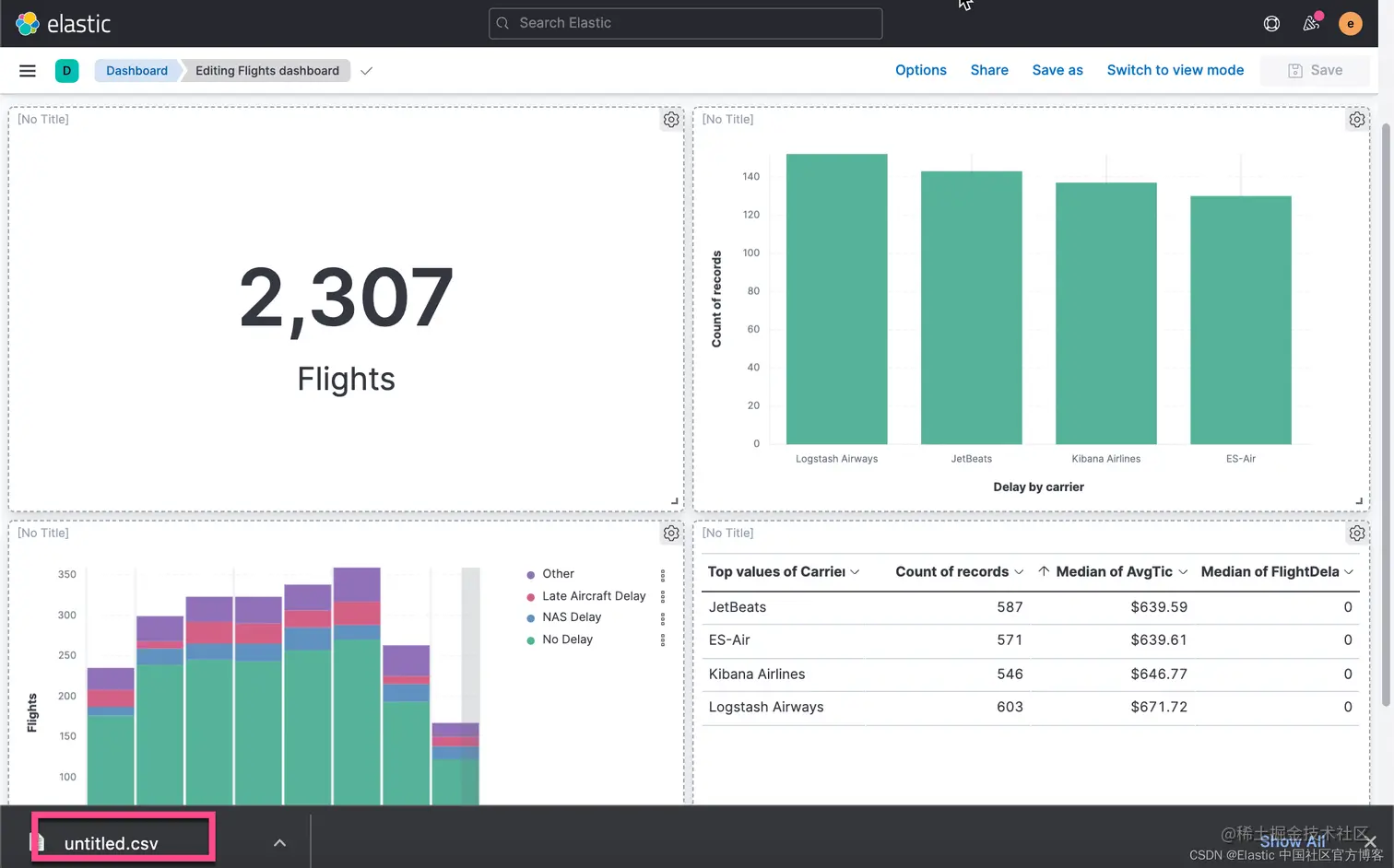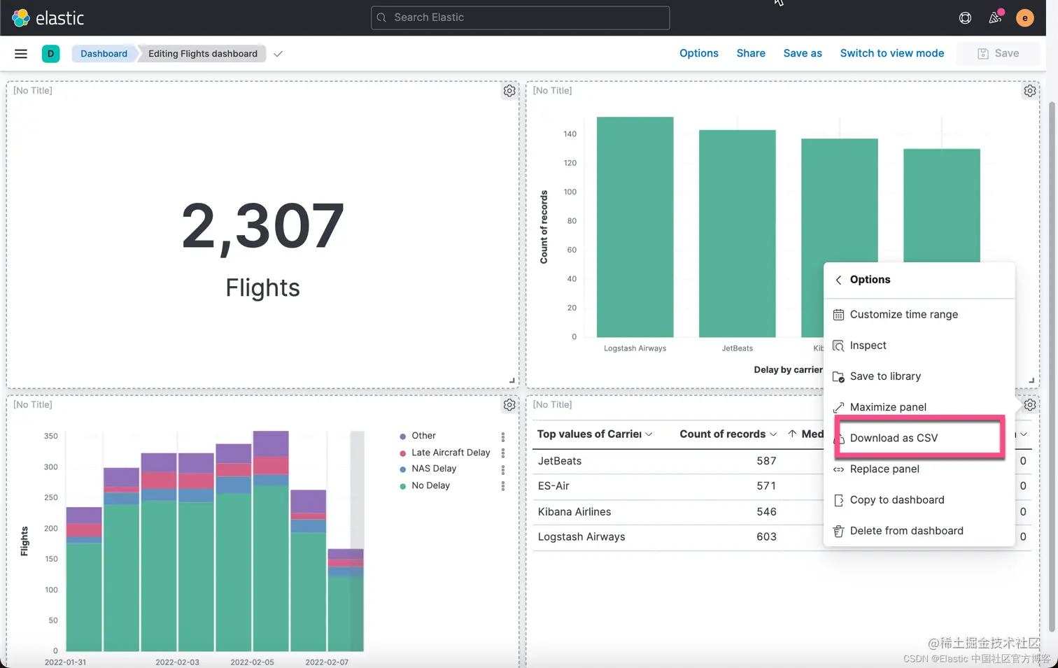 我们还是打开我们之前创建的 Flights Dashboard,并选中其中的一个可视化: